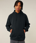 Raglan sleeves. Double-layered hood in self-fabric. Kangaroo pocket at front. 1x1 ribs at sleeve cuffs and bottom hem. 1x1 rib side panels. 1x1 rib bindings at pocket openings. Double-needle topstitches at the collar, sleeve cuffs and bottom hem. Three-needle flatlock stitches at raglan seam and side panel seams. Inside herringbone back neck tape. Self-fabric half moon at the back neck.